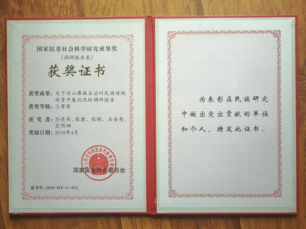 近日,国家民委2017年度全国民族工作优秀调研报告评选结果揭晓。金年会官网孙亮亮副教授带领研究团队完成的《关于凉山彝族自治州民族传统体育开展状况的调研报告》,荣获国家民委社会科学研究成果奖(调研报告类)三等奖。
