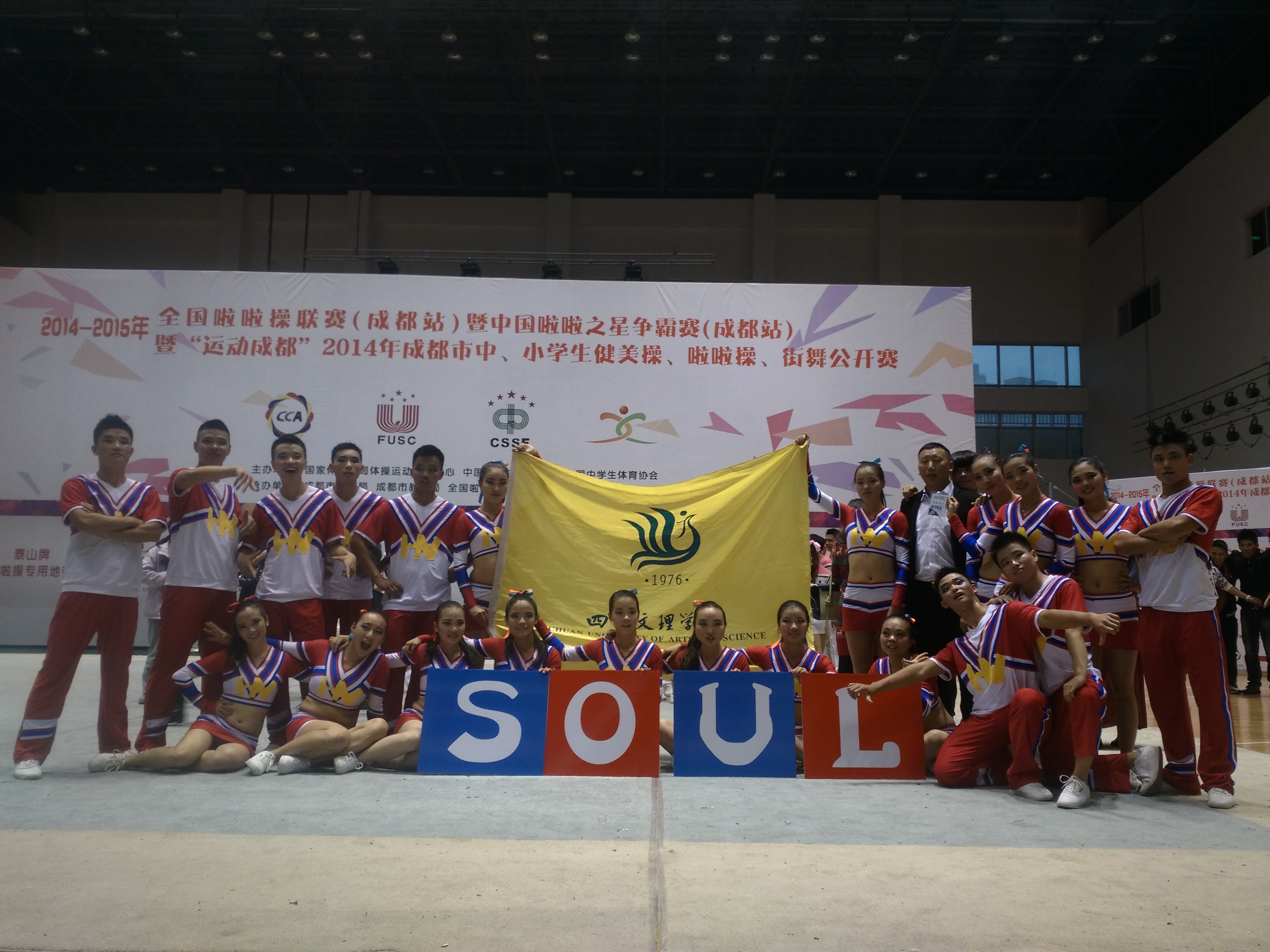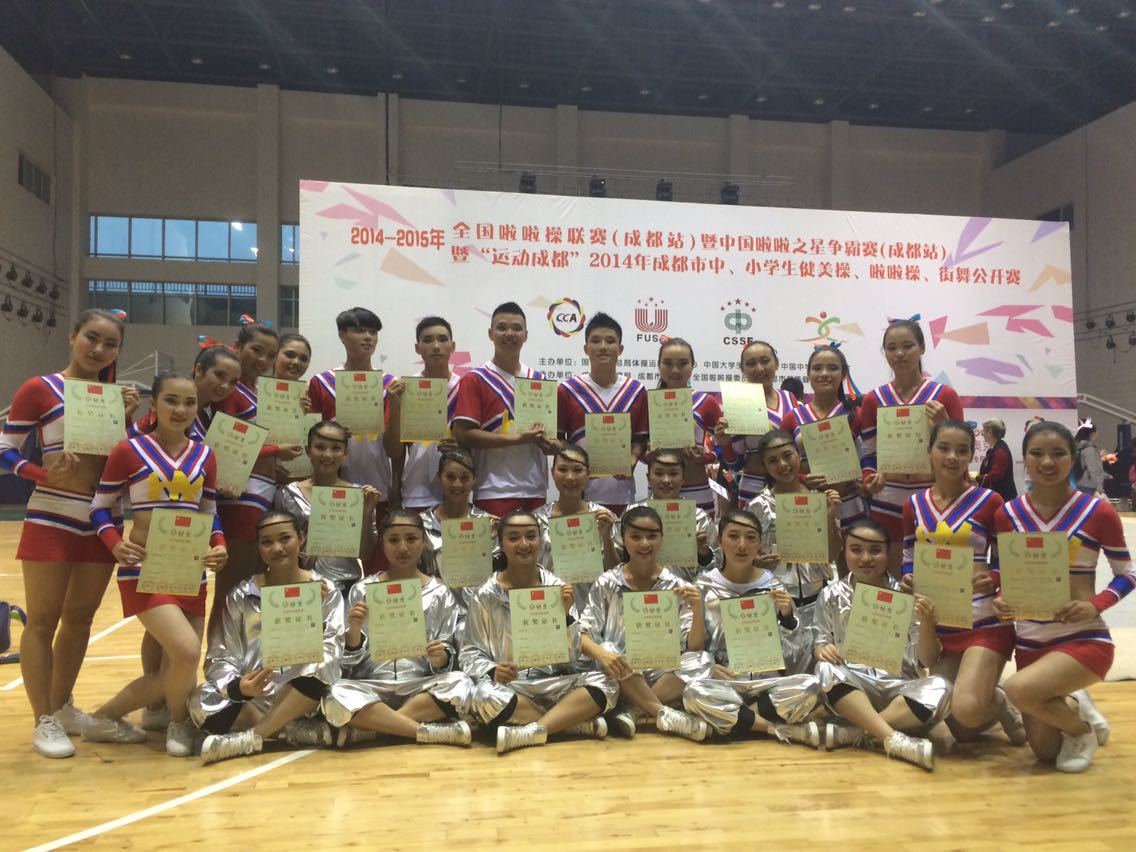 2014年10月25日至26日,2014-2015年全国啦啦操联赛(成都站)在成都中医药大学(温江校区)隆重举行。金年会官网金年会jinnianhuicom两支参赛队soul team和hot team在唐绪明老师带领下参加了比赛。两支队伍经过顽强拼搏,分别以第二名的优异成绩进入了决赛。