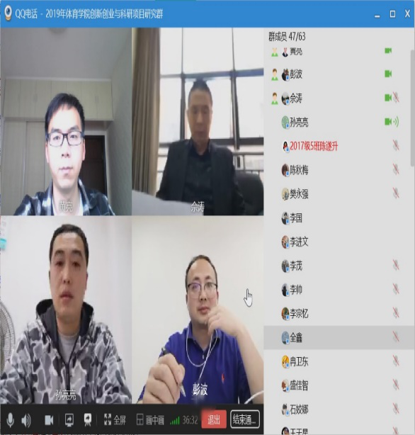 为进一步推动学院大学生创新创业训练计划项目、大学生科研项目有序开展,体育学院于2020年4月15日下午召开大学生创新创业训练计划项目和大学生科研项目线上推进会。学院院长佘涛、副院长孙亮亮、党总支副书记彭波、教学科研办主任李进文以及项目指导教师和负责同学参加了会议。会议由彭波主持。