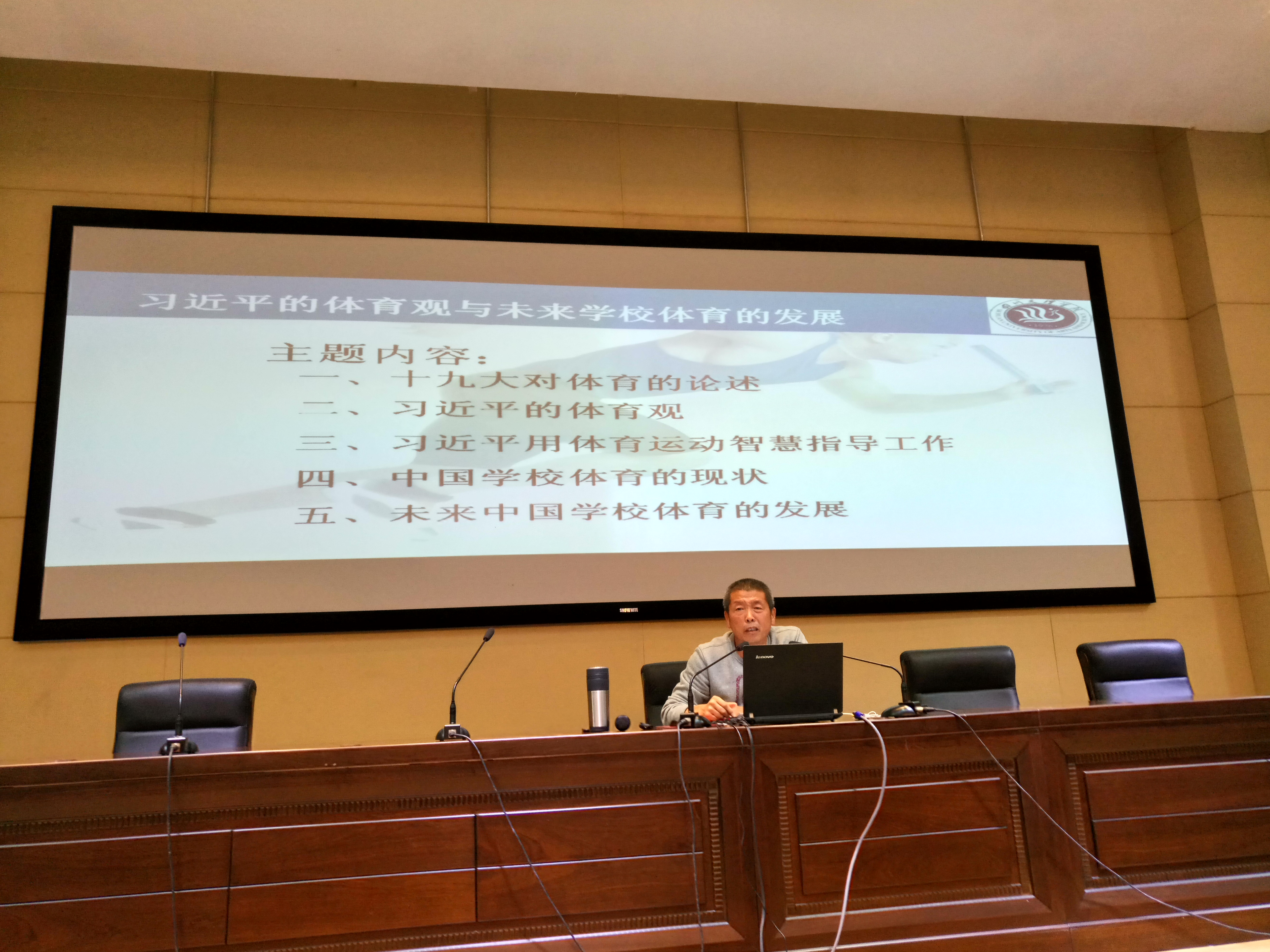 董立教授围绕“习近平的体育观与未来学校体育的发展”这一主题,通过五点详细解读了习近平同志的体育观与体育实践。首先他逐句解读了习近平同志在“党的十九大报告”中对体育的论述。“广泛开展全民健身活动”:“运动”与“活动”虽然只是一词之差,却反映出体育在中国特色社会主义进入新时代后的新使命。习近平同志将全民健身与全民健康、全面小康高度关联,体现了中国共产党人为中国人民谋幸福,为中华民族谋复兴的初心和使命。“加快推进体育强国建设”:这是有史以来党代会报告中第一次提出“体育强国建设”。“筹办好北京冬奥会、冬残奥会”:相隔10年时间,党代会报告再次提及筹办好大型赛事,反映出体育在中国特色社会主义进入新时代后的新功能。接着,董立教授结合习近平5年来对体育的主要论述、重视足球发展和习近平的体育实践,详细分析了习近平的体育观。第三,董立教授介绍了习近平善于运用体育运动智慧指导日常工作和外交活动。接下来,董立教授分析了中国学校体育现状。最后,董立教授指出“在人工智能、大数据时代,体育仍然是不可替代的”,勉励在座师生“学好体育,享用终身”,以身作则,转变学校体育观念,让学校体育育人的各项功能充分显现,从以前以增强学生体质的单一教学,变为全方位育人的手段。学生通过运动竞赛、运动训练,培养吃苦耐劳的精神、集体主义精神和协同配合的精神。