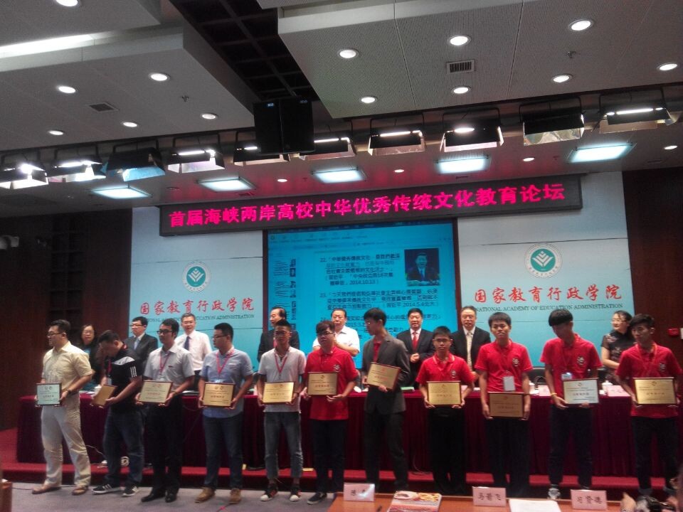 2015年7月1日至3日,由中国高等教育学会和两岸文教经贸交流协会联合主办的“首届海峡两岸高校中华优秀传统文化教育论坛”在北京国家教育行政学院隆重举行。金年会官网武术协会荣获海峡两岸高校“儒风雅社”优秀组织奖。