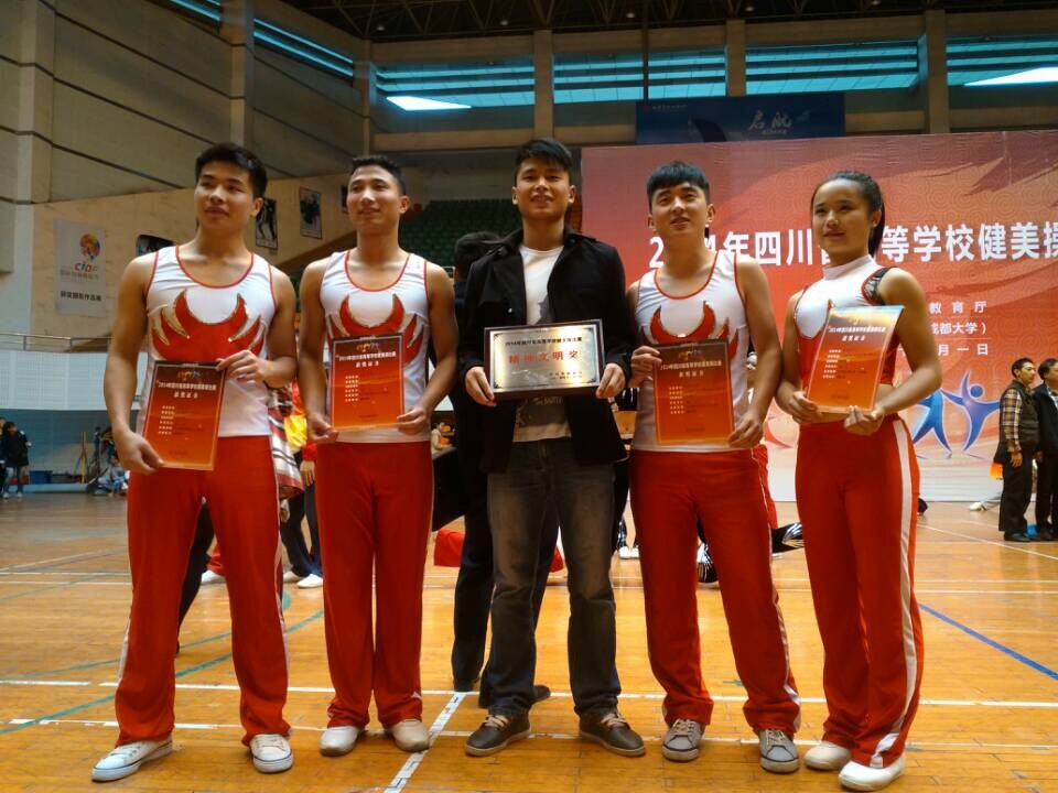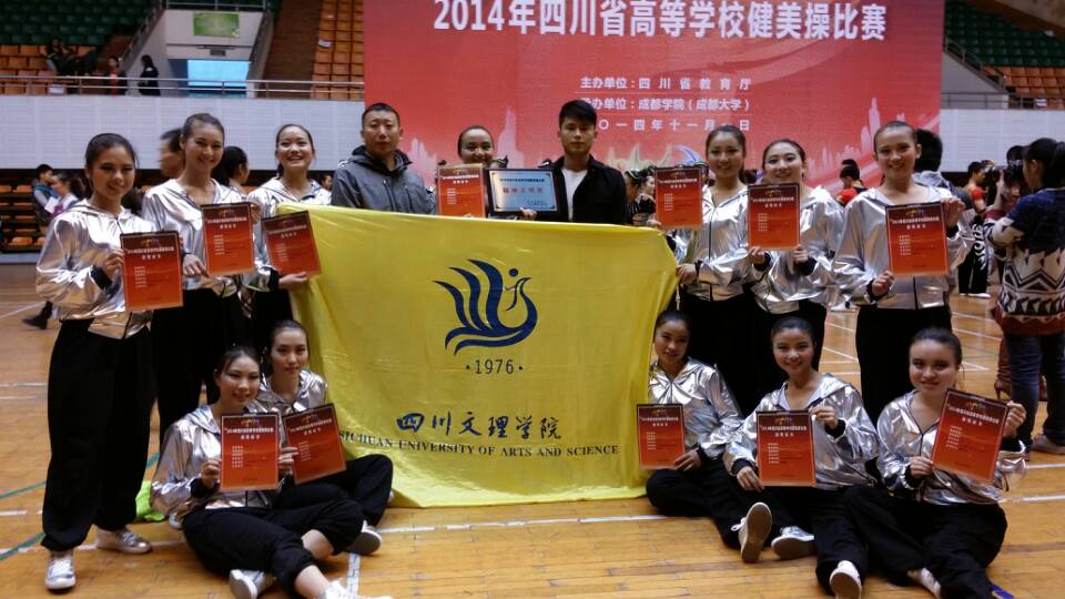 由四川省教育厅主办的“2014年四川省高等学校健美操比赛”于10月31日至11月2日在成都大学隆重举行。这是四川省高校健美操最高水平比赛,全省共有19所高校近300名运动员参赛。金年会官网两支参赛队伍在佘涛书记,教练员唐绪明老师和刘伟同学的带领下努力拼搏,不负众望,在自由舞蹈、大众健美操规定套路五级两个比赛项目中都取得第一名的好成绩,同时还荣获大赛精神文明奖。