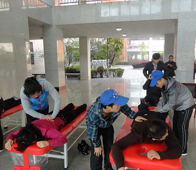 推拿与按摩,是本系特色课程之一,为了搭建教学实践平台,加深学生对这门课程知识的学习和掌握,3月27日9:00,我系2010级38名学生组成志愿服务队,在莲湖校区教学楼一楼和行政楼三、四楼开展了“推拿按摩志愿服务”活动。