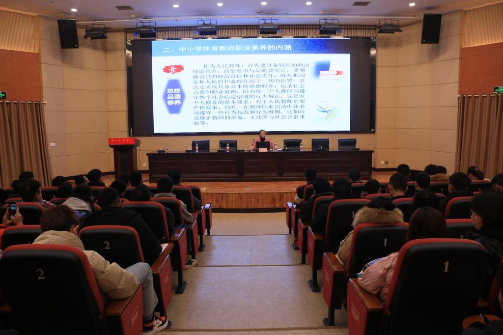 2020年11月22日19:00,金年会jinnianhuicom副教授覃雪芹在莲湖校区学术报告A厅作了关于《中小学体育教师的职业素养养成》的学术讲座。金年会jinnianhuicom党总支书记王兆忠、院长佘涛、党总支副书记彭波、教学科研办主任李进文、科研秘书黄亮及金年会jinnianhuicom师生三百余人参加了此次讲座。讲座由副院长孙亮亮主持。