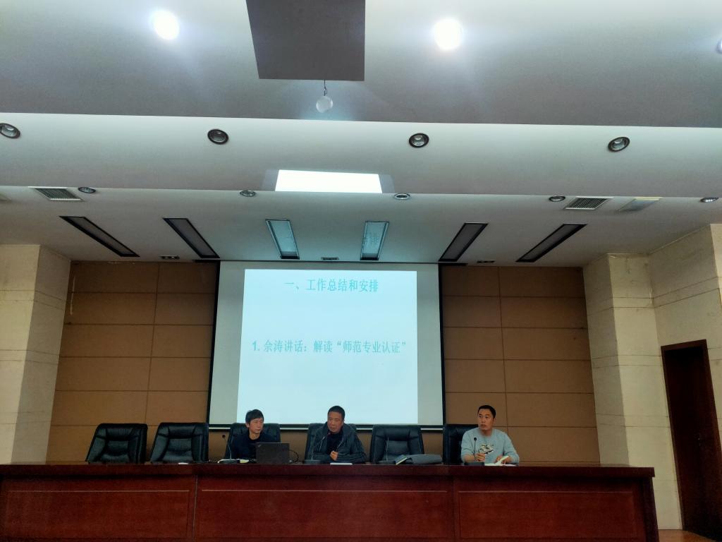 佘涛传达程校长有关师范专业认证的讲话精神。首先,他介绍师范专业建设现状;其次分析现阶段存在的不足及改进措施;再从指导思想、工作目标、工作思路、建设认证对象、组织管理等五个方面解读了师范类专业建设与认证工作方案;最后,他强调全院师生要高度重视师范专业认证,要积极思考认证认识问题、需求调研问题、培养体系问题、质量保证问题、认证材料问题;同时要加快硕士学位授权点建设进度。