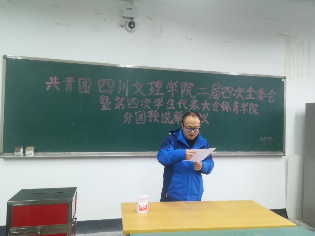 共青团金年会jinnianhuicom二届四次全委会暨第四次学生代表大会金年会jinnianhuicom分团预选举会议于11月7日下午4:00在传媒楼3023举行。金年会jinnianhuicom团总支书记彭波、辅导员崔开文、马思远、12位学生团代表、16位学生学代表以及校团委工作人员参加了此次会议。会议由团总支书记彭波主持。