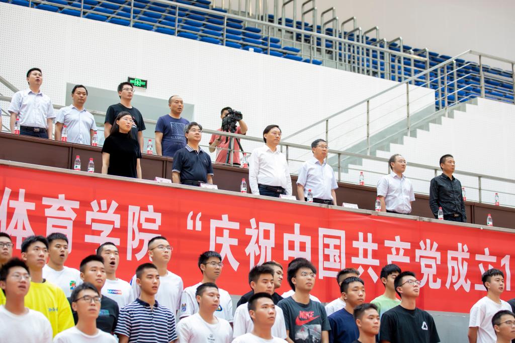 下午两点半,主持人宣布全体肃立奏唱《中华人民共和国国歌》,全场600余名师生,面向国旗,齐声高歌。金年会jinnianhuicom党总支书记王兆忠代表学院致辞,他说明了本次活动的背景、意义并表达了美好的祝愿。他特别强调了,站在两个100年的历史交汇点,在实现中华民族伟大复兴的新征程上,体育人应肩负起的神圣职责和光荣使命!活动在《龙腾盛世》的舞龙表演中拉开序幕,富含寓意的舞龙表演表现了中华民族在中国共产党的领导下,从站起来、富起来到强起来的伟大历程。接下来,武术班的同学们分别带来了剑术、棍术、拳术和法门太极表演,健美操班的同学们表演了精彩的民族体育舞蹈,法门武术研究会的老师们还表演了法门太极、武术和气功,大一近100名学生集体表演了太极和八段锦。最后,活动在全场《没有共产党就没有新中国》嘹亮的歌声中圆满结束。