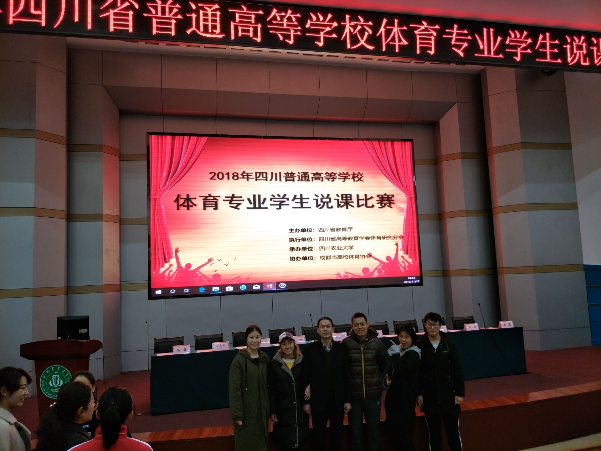 2018年11月15日至17日,由四川省教育厅主办的2018年四川省普通高等院校体育专业学生说课比赛在四川农业大学圆满落幕。经过两天的激烈竞争,金年会jinnianhuicom吴嘉瑞同学获得理论组一等奖,康利菊、曾子芮和陈念等三名同学获得三等奖,四川文理代表队荣获团体二等奖,成绩较以往有较大突破。陈碧述教授获得“优秀裁判员”称号。