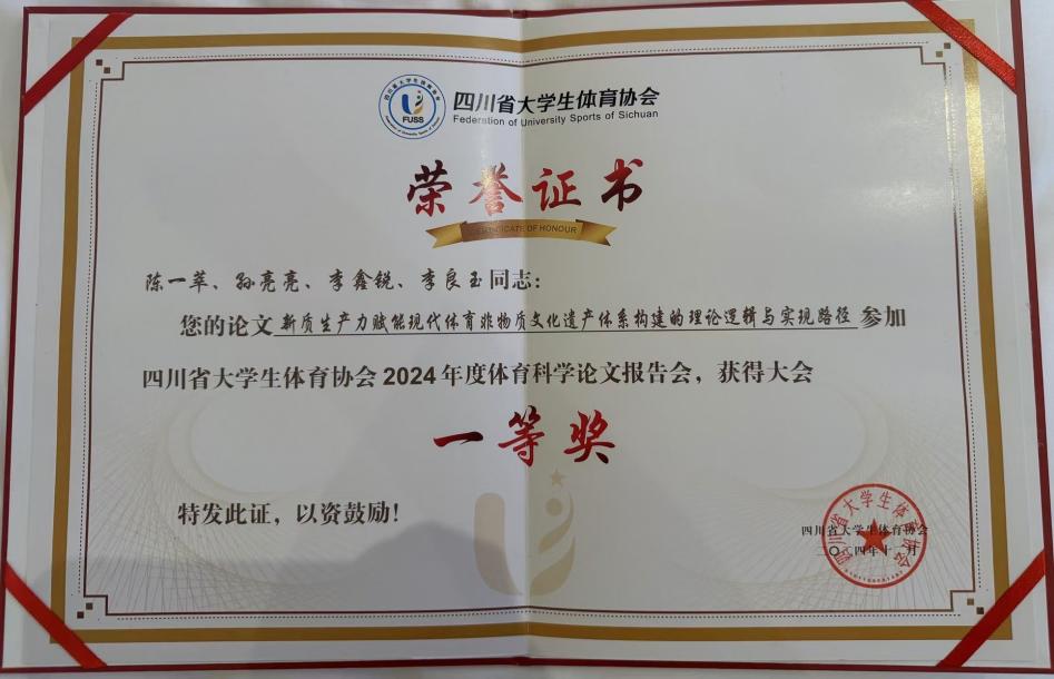在此次科报会上,金年会官网联合培养的研究生陈一萃撰写的论文《新质生产力赋能现代体育非物质文化遗产体系构建的理论逻辑与实现路径》获一等奖,并作为唯一一位学生代表在会上进行了交流发言。