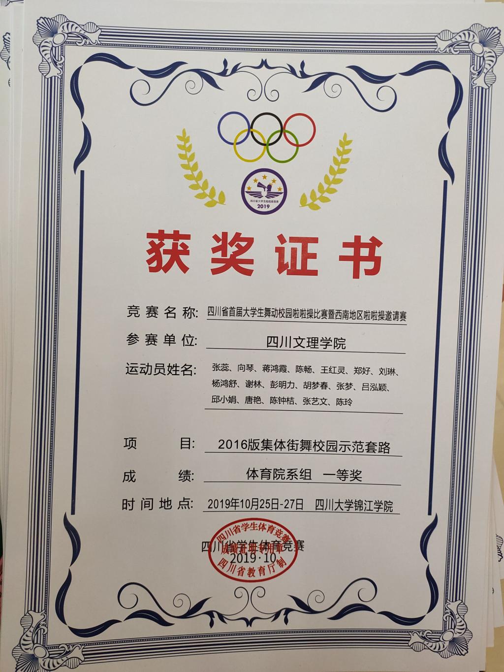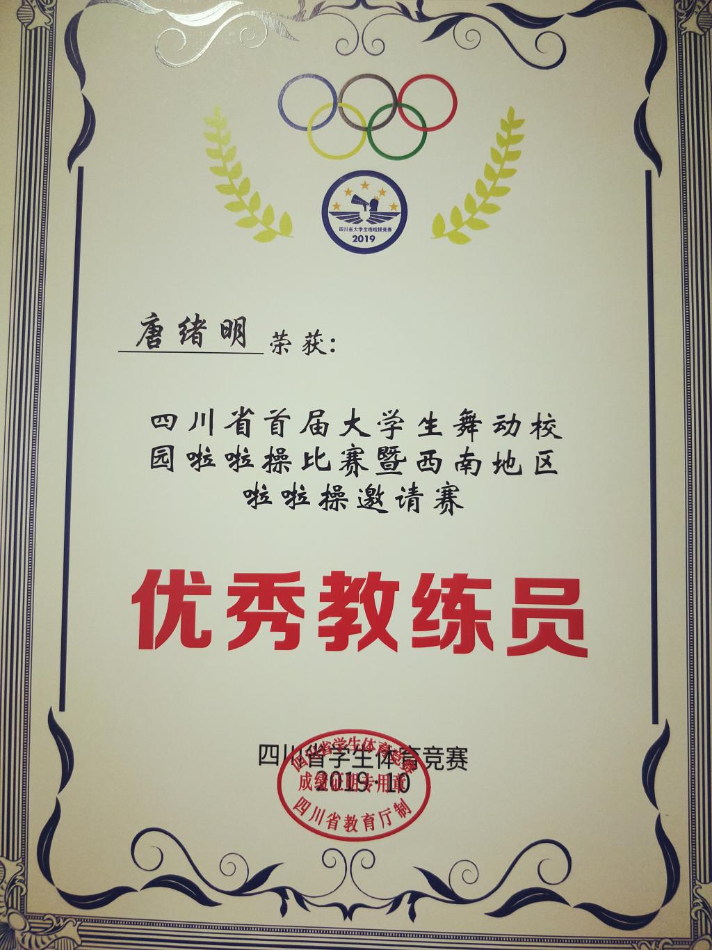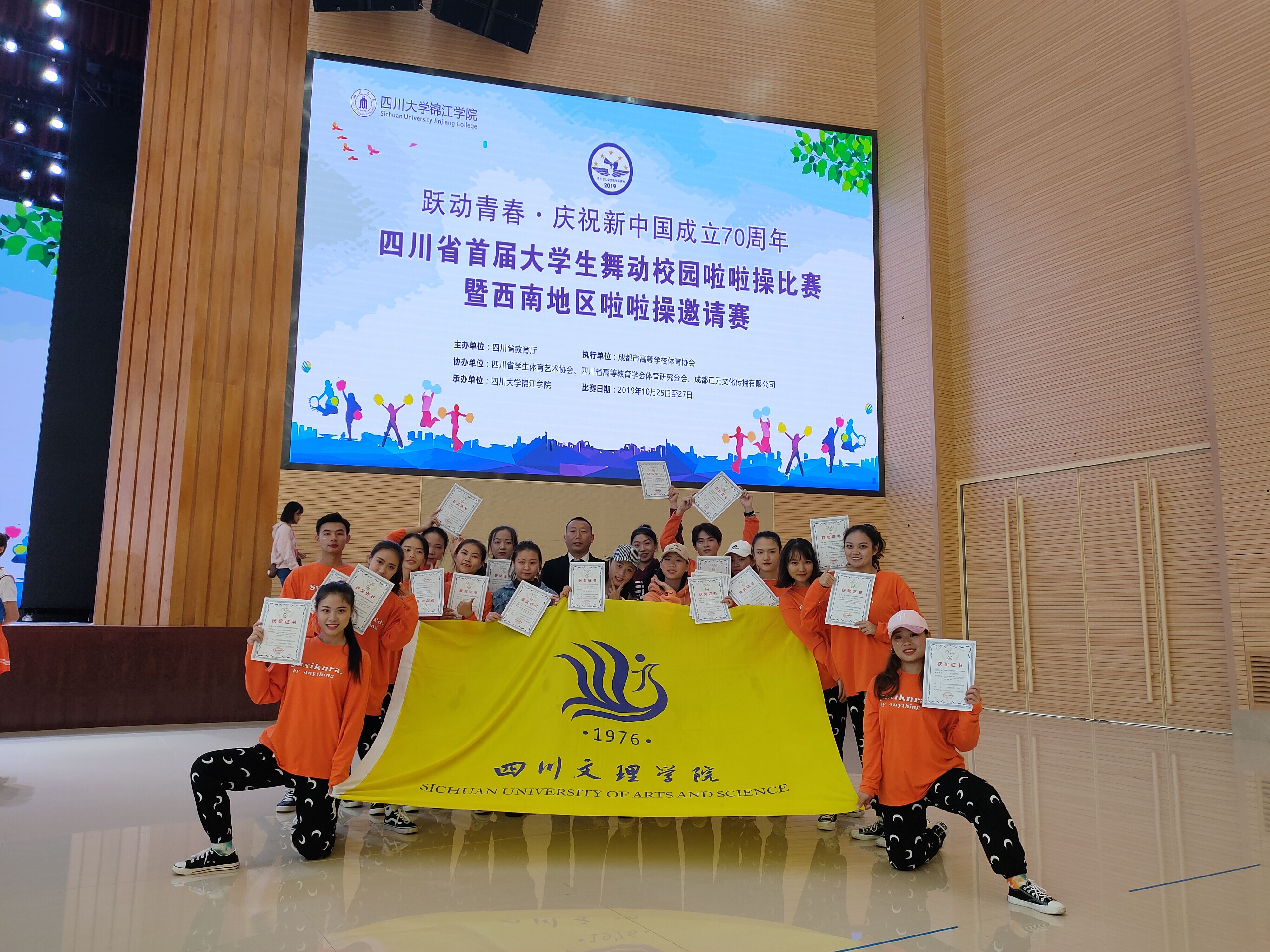 四川省首届大学生舞动校园啦啦操比赛暨西南地区啦啦操邀请赛在四川大学锦江学院隆重举办。金年会jinnianhuicom谢林,向琴,陈畅,张蕊,刘琳等十八名同学组队在教练唐绪明老师的带领下代表学校参赛。赛前,教练唐绪明老师牺牲了大量的休息时间悉心指导,学院许汝霞老师也给予了及时的帮助,同时,队员们发扬“艰难困苦,玉汝于成”的文理精神刻苦训练。在比赛中,队员们发扬团队拼搏的精神,以饱满的激情和精湛的技艺,赢得了观众的喝彩和评委的好评。在2016版校园啦啦操街舞示范套路和2016版校园啦啦操花球示范套路两场比赛都获得了体育院校组的第一名好成绩。唐绪明老师也获得“优秀裁判员”和“优秀教练员”的荣誉。