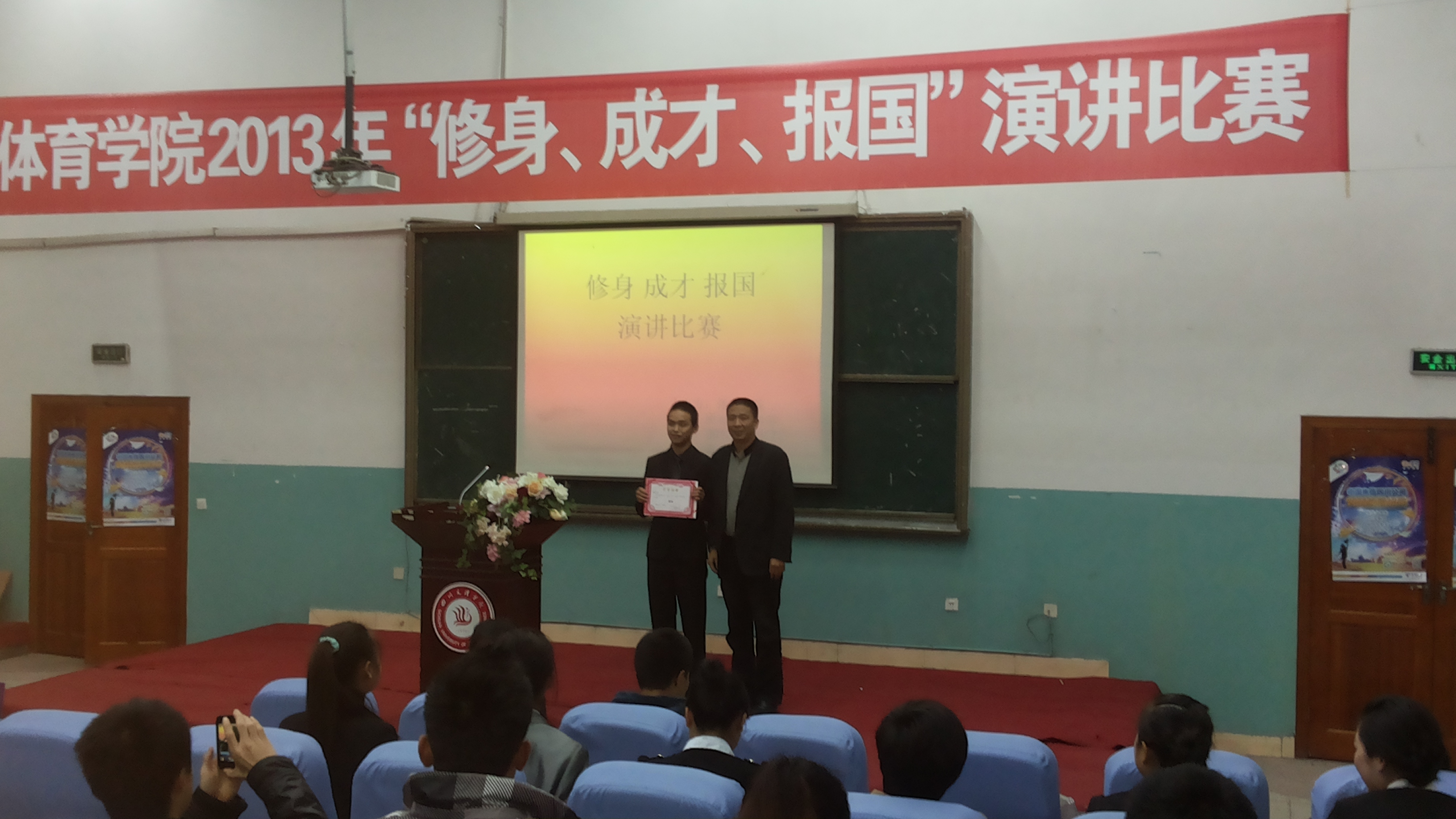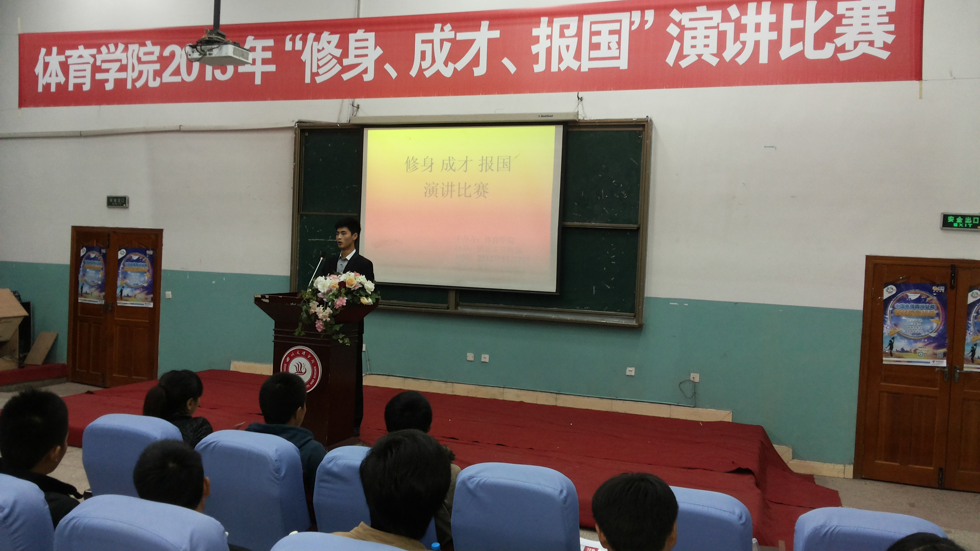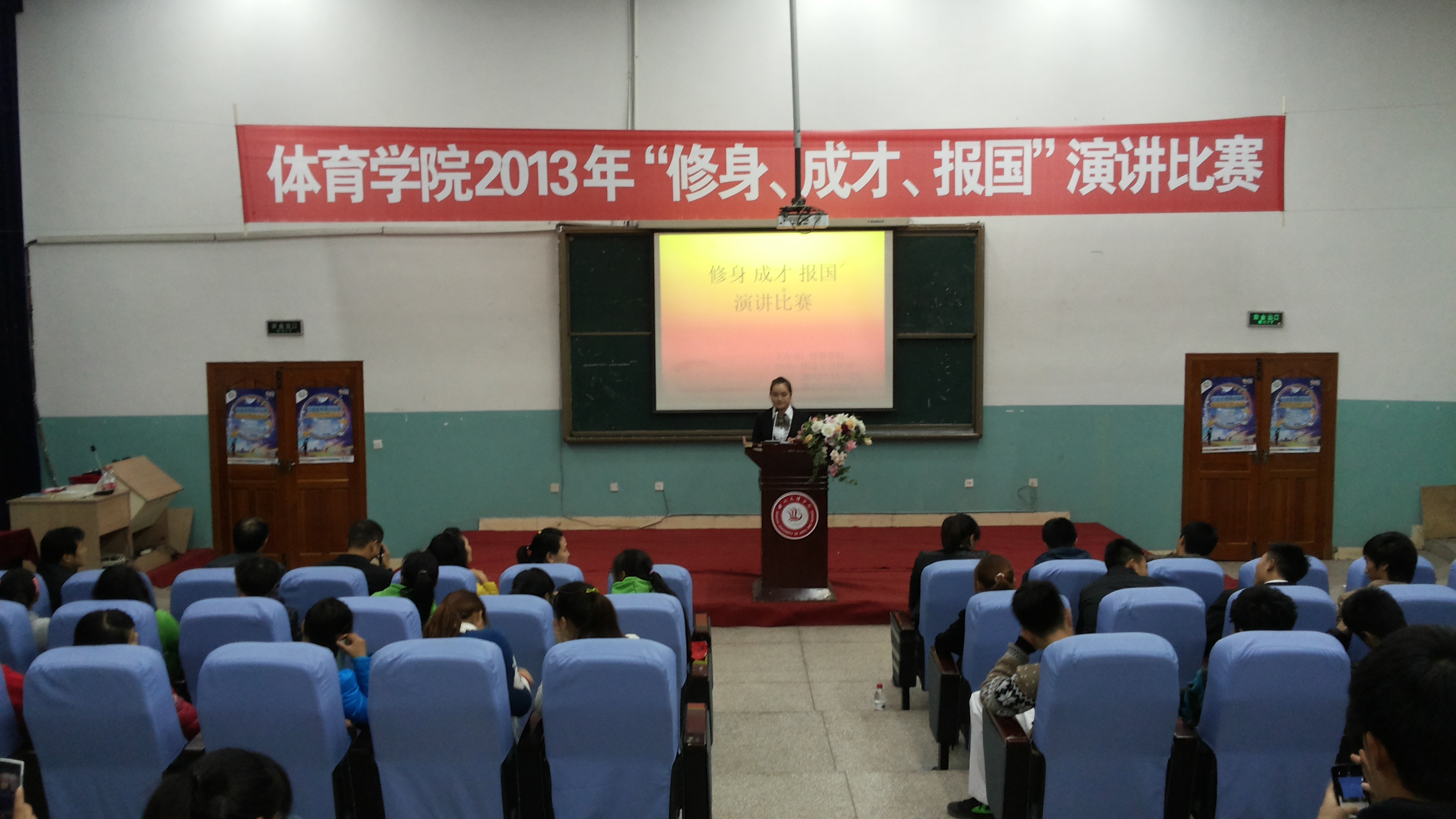 2013年11月7日,金年会官网在莲湖校区113教室成功举办了第十四届“修身、成才、报国”演讲比赛。金年会官网党总支书记佘涛、副主任陈碧述、副书记张皓、辅导员李霞、那明明及体育系团总支学生会的重要干部担任了本次比赛的评委。2013级200余名学生共同观看了比赛。本次演讲比赛由何其波同学主持。