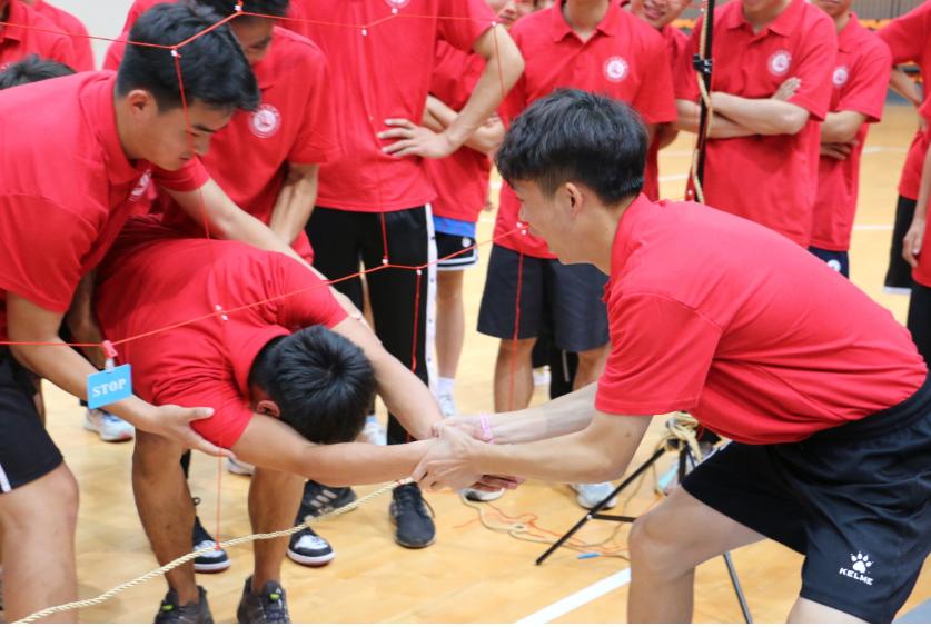 通过趣味项目进行了热身后,宋老师组织同学们开始“穿越电网”项目训练。活动中,同学们从最开始的手忙脚乱、不知所措、需要帮助到选出队长、在队长指挥下团结协作、有序实施每一步行动。随着难度的不断增加,部分同学出现失误,导致队长不断接受惩罚,同学们开始意识到自己的失误不仅连累了队长,还影响了整个团队。随即有队员陪同队长一起受罚,到最后所有同学一起陪同队长受罚。在项目体验过程中,同学们深刻认识到必须摆正自己的位置,做好自己本职工作,不给团队添麻烦,高度协作,才能共同实现目标。大约一个小时,在同学们的共同努力下,最终完成既定目标,发出愉快的欢呼声。