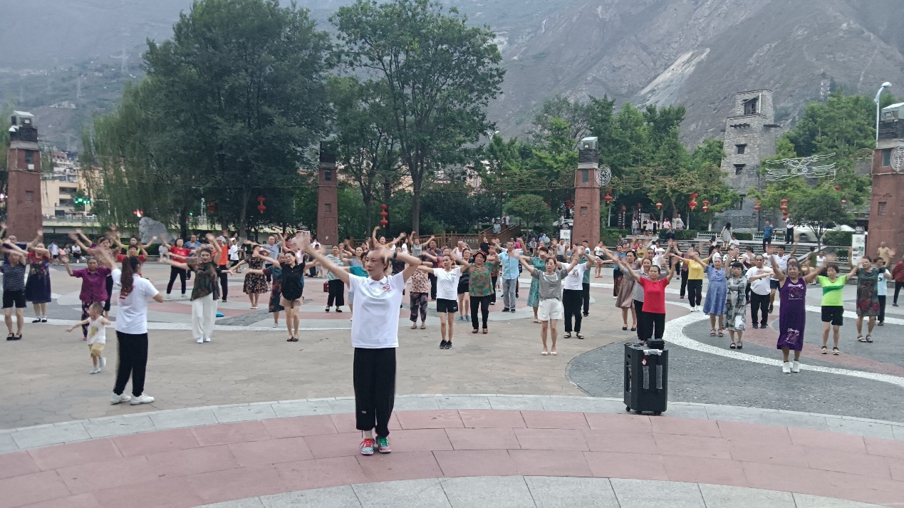 8月19日下午,践行团在汶川县威州镇锅庄广场组织当地居民(约100人)一起开展了全民健身活动。活动结束后当地居民热情邀请践行团成员一同参与当地特色广场舞锅庄舞。