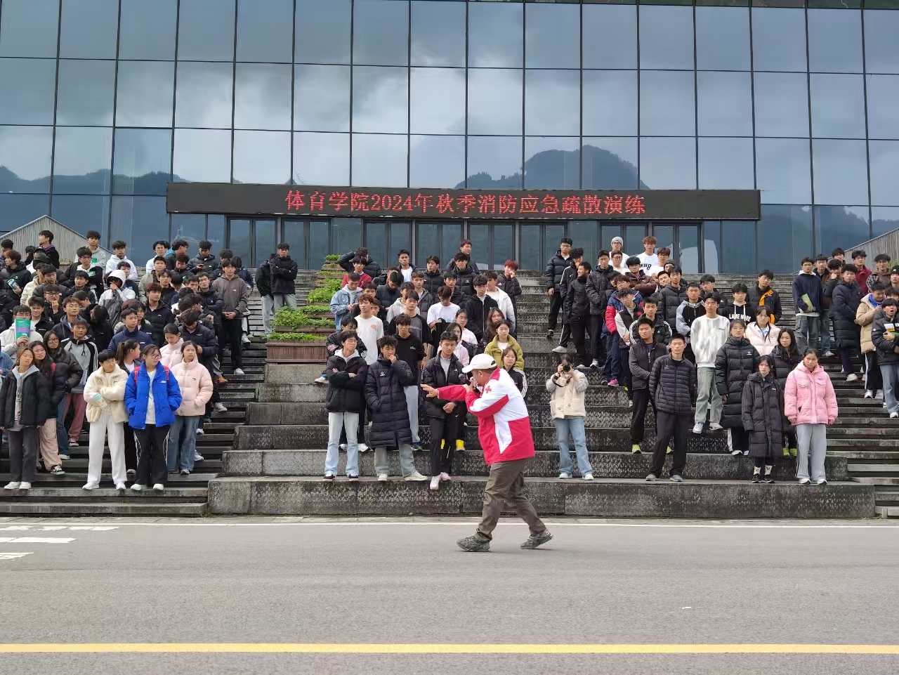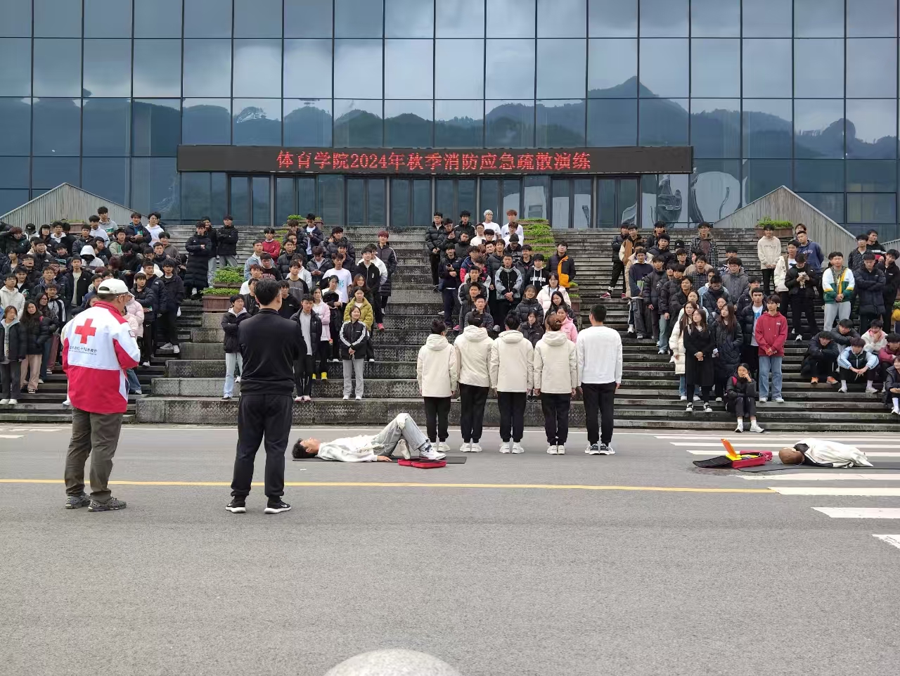 2024年11月22日12点整,金年会jinnianhuicom于体育馆开展了消防应急疏散演练。学院党委副书记靳浪、辅导员邓超、李波、专任教师宋京林、7 名红十字救护员及2024 级全体学生参与此次活动。