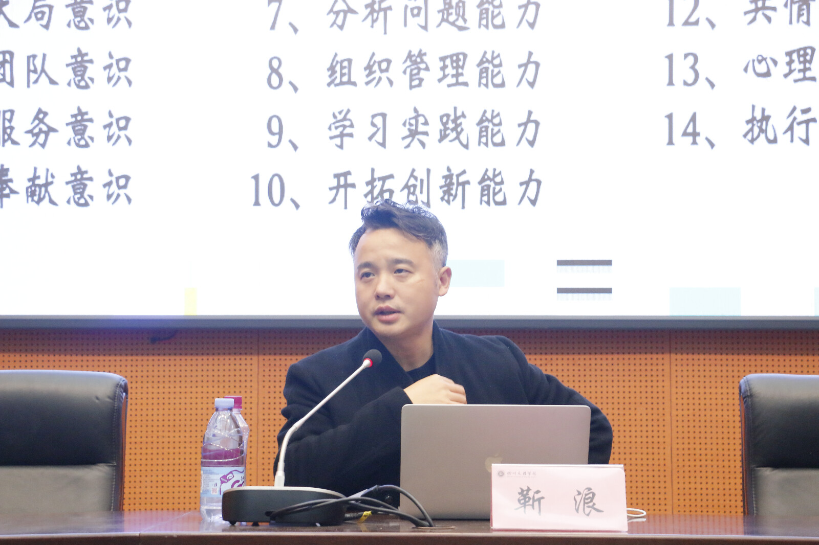 2024 年 12 月 11 日 16:30, 学院团总支在学术报告厅B厅举办了“宝剑锋从磨砺出——谈谈学生干部的自我修养”为主题的讲座,党委副书记靳浪担任主讲,团总支学生会干部、干事和各班班长团支书参会。讲座由学工办主任兼团总支书记祝利平主持。