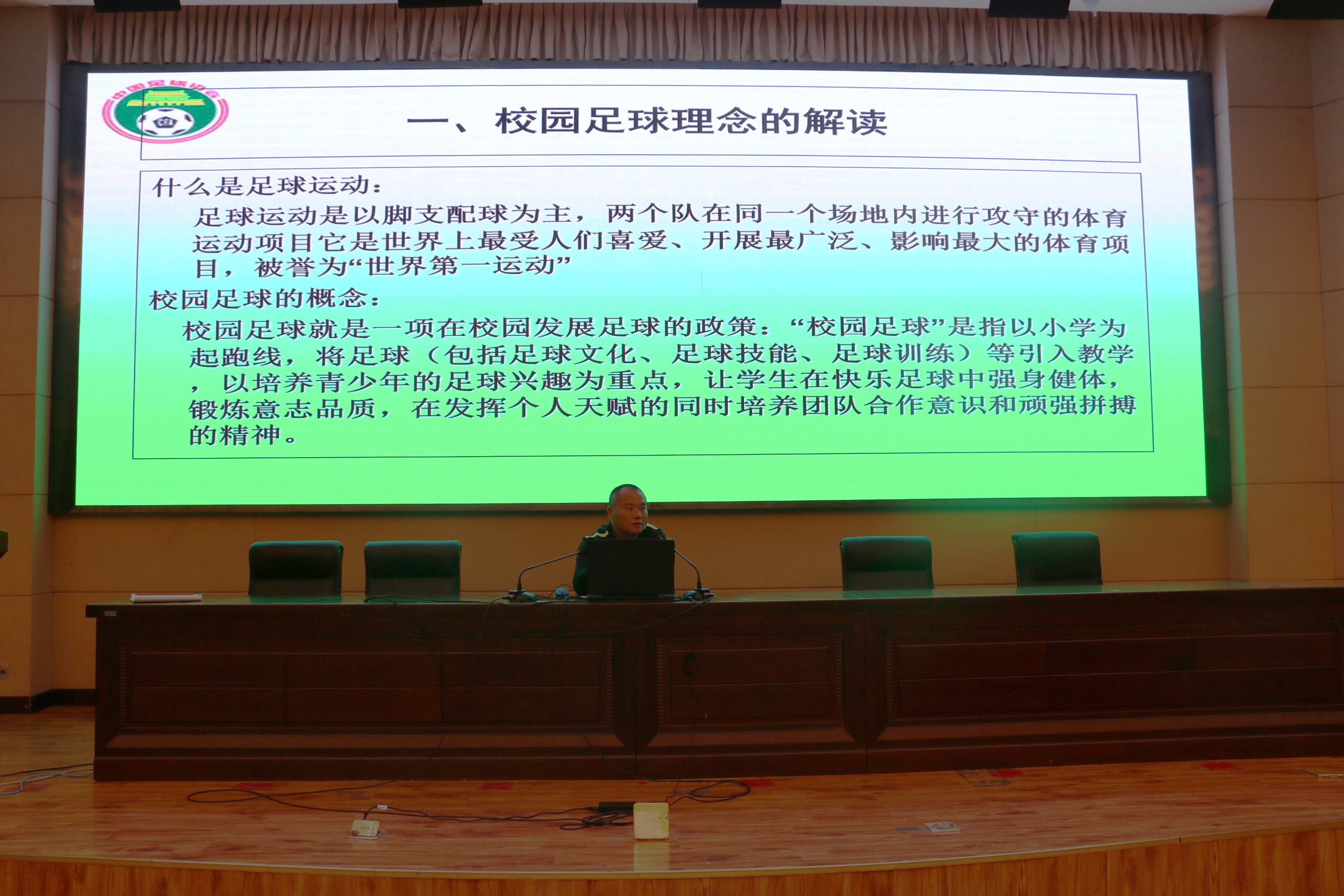 首先,付宏教授解读了校园足球的概念、理念及开展校园足球的意义,开展校园足球有利于激发学生统一拼搏、共同协作等团队精神;其次,谈到校园足球的发展现状及我国足球同其他国家足球的差异,通过比较足球人口、教练员、足球队伍、足球场地,更直观的说明了培养足球人才主要的路径之一就是从校园开始;最后,分析介绍了校园足球各培养阶段的培养目标与基本思路,足球可以让学生们更具有集体精神和凝聚力,有力促进了青少年全面发展,也说明了校园足球发展的重要性。