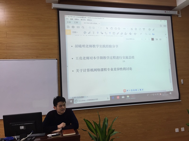 永利官网网络课程群教学团队于2017年12月13日星期三下午2点30在文津楼622报告厅召开了团队工作会议。本次会议首先由团队负责人王涛向团队成员传达了学院的相关通知。为迎接即将到来的教学评估,团队对本学期期末以及下学期工作做了详细安排。具体包括:1.注意出题试卷的规范性和本科毕业论文规范性;2. 教学大纲和实验大纲进一步审定,为出版做好准备;3. 筹备本团队内大数据、云计算和人工智能相关方面的课程;4. 涉及本科教学质量工程年的老师准备总结报告。