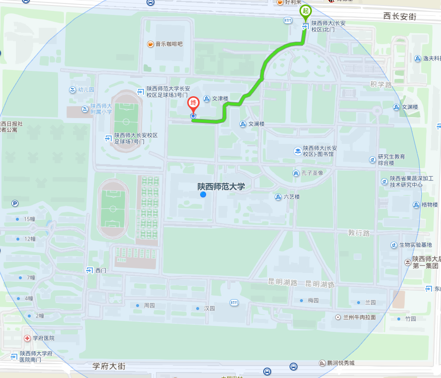 从陕西师大(长安校区)北门向正南方向出发,走60米,右转进入书山道,沿书山道走170米,右转进入积学路,沿积学路走10米,离开积学路,向左前方转,走130米,右转穿过马路继续向前,走10米,向左前方转,走60米,右转,走70米,到达yL23411永利官网登录文津楼,yL23411永利官网登录在文津楼三段四层。