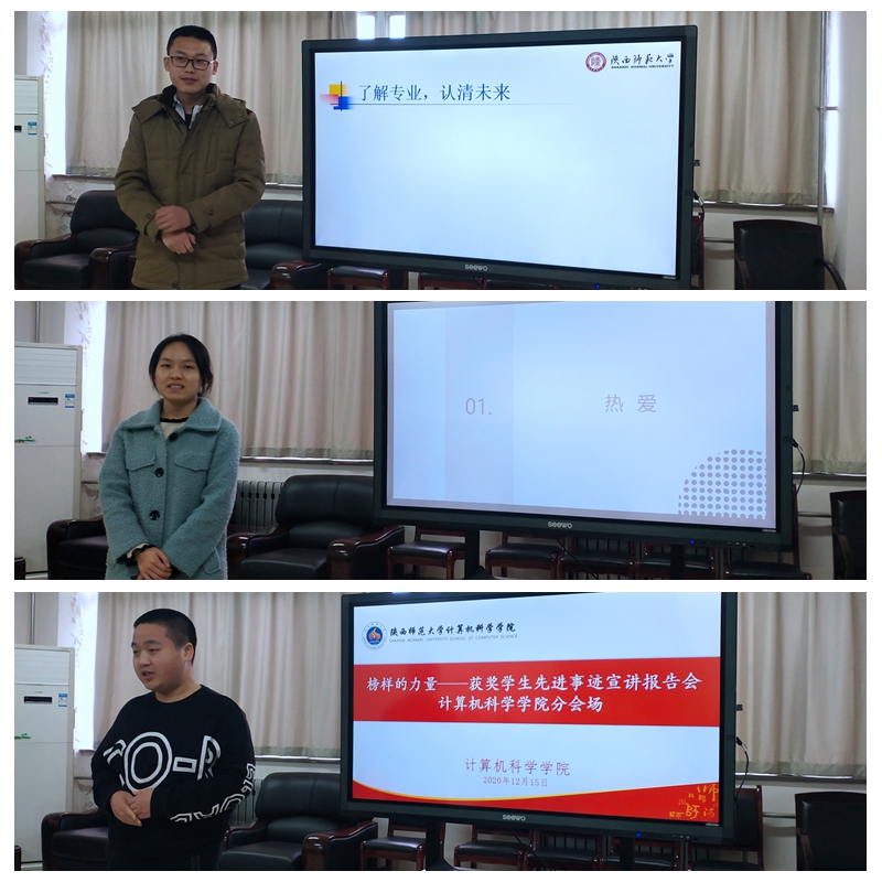 为贯彻落实习近平新时代中国特色社会主义思想和党的十九大精神,在学生中树立榜样,以学生个人事迹引导和激励同学积极践行“西部红烛精神”,用实际行动迎接中国共产党成立100周年,永利官网于12月7日晚分别在文津楼1116、1319以各年级主题晚点名的形式进行先进事迹宣讲报告会。本次报告会由2020年第三届“感恩中国近现代科学家”奖学金获得者2018级刘国伟,2020年国家奖学金获得者2018级靳雨欣以及2020年国家励志奖学金获得者2017级刘真同学主讲,yL23411永利官网登录2018级、2019级本科生参与本次宣讲会,会议分别由2018级本科生辅导员安琪、2019级本科生辅导员崔瑜璠主持。